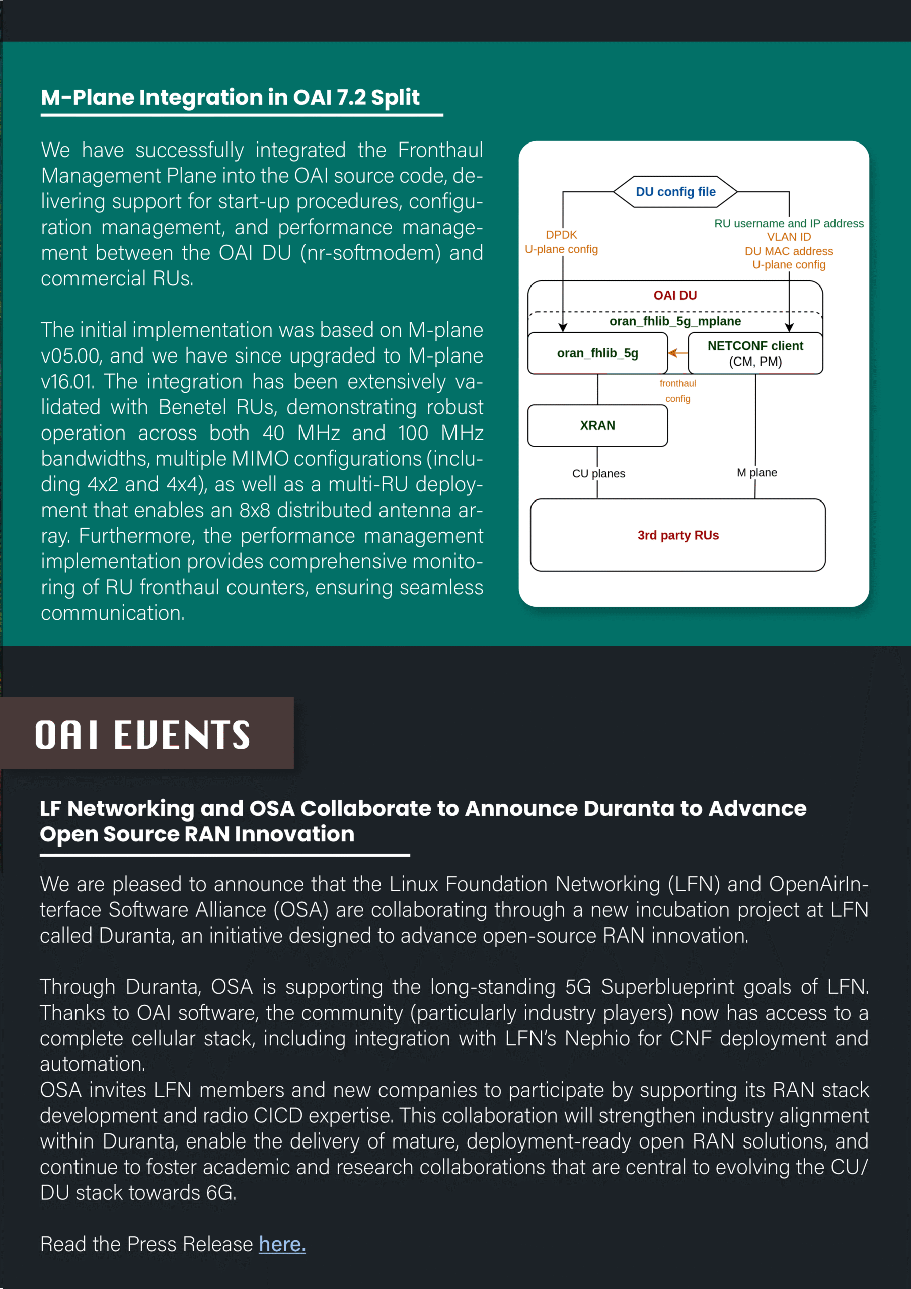 This edition features highlights from our Summer Workshop in Sweden, technical updates on OAI RAN, Core, and OAM, as well as news on our joint incubation project with LFN: Duranta.